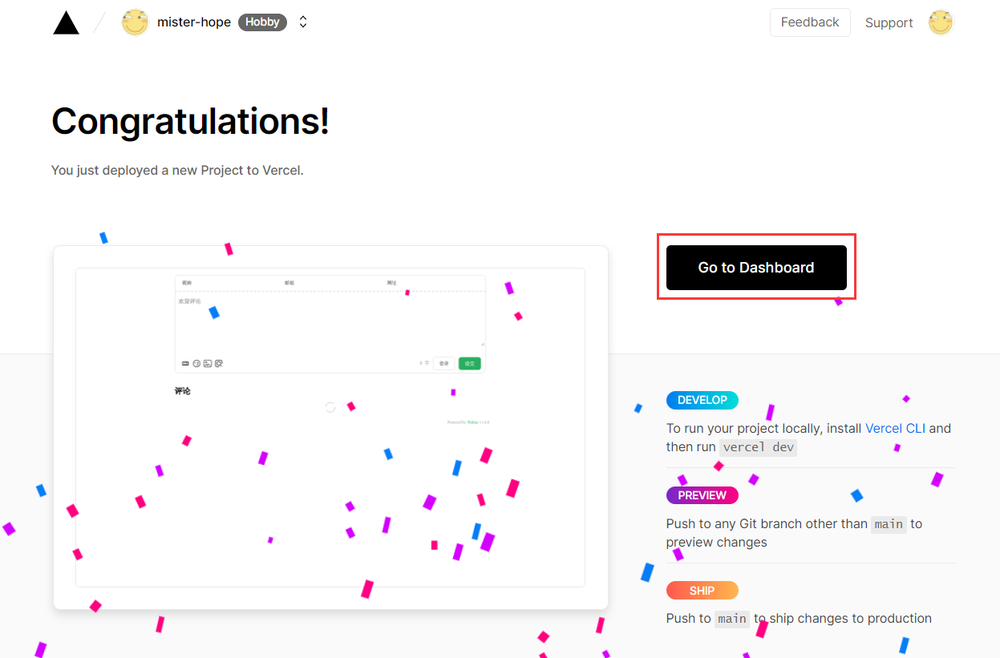一两分钟后,满屏的烟花会庆祝你部署成功。此时点击 Go to Dashboard 可以跳转到应用的控制台。